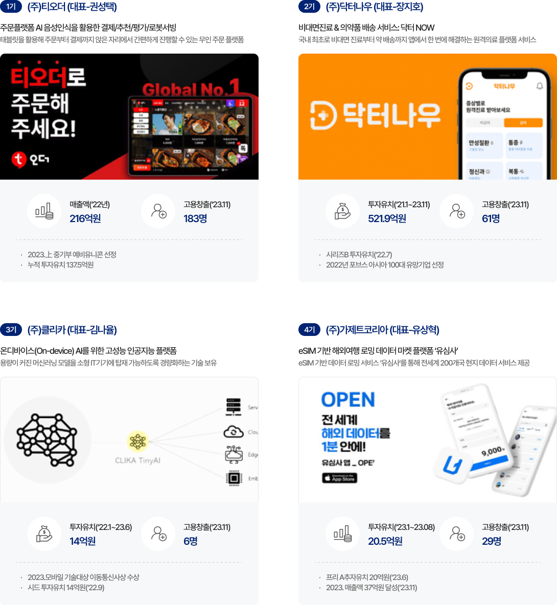| 제 4기(‘23) | 59명 | 17,509백만원 | 5,844백만원 | 153명 | $2,258,333 | 10개사 |